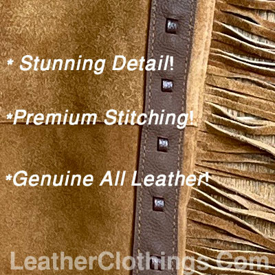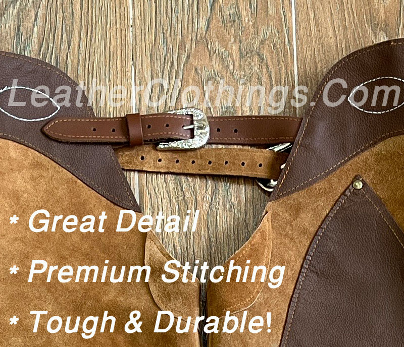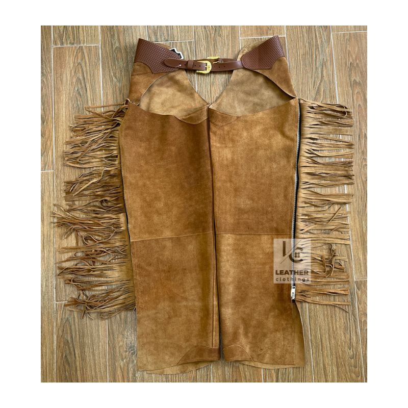 Check out our excellent brown leather chaps! They’re an accurate representation of the classic Western style. Made with premium leather and detailed with intricate fringe, these chaps perfectly balance ruggedness with sophistication. They’re designed for both comfort and durability, making them the perfect companion for any cowboy.