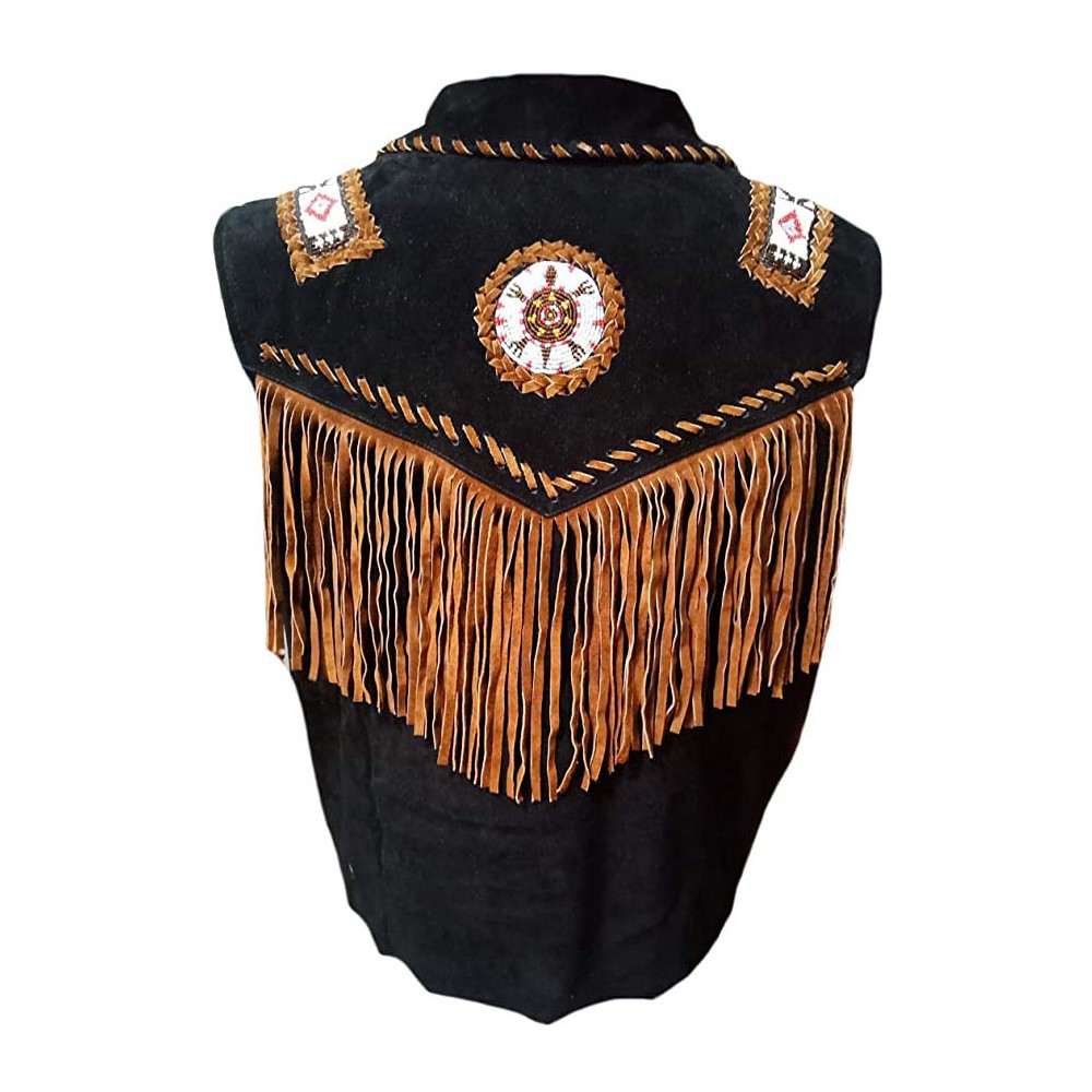 Cowboy Black Suede Western Vest American Indian Vests With Fringes Beads Bones