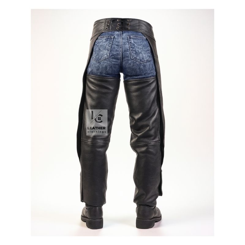 The Black Leather Assless Chaps are designed for riders who want a bold look along with comfort and practicality. They are crafted from high-quality, genuine leather, which lends them a rugged and stylish appearance