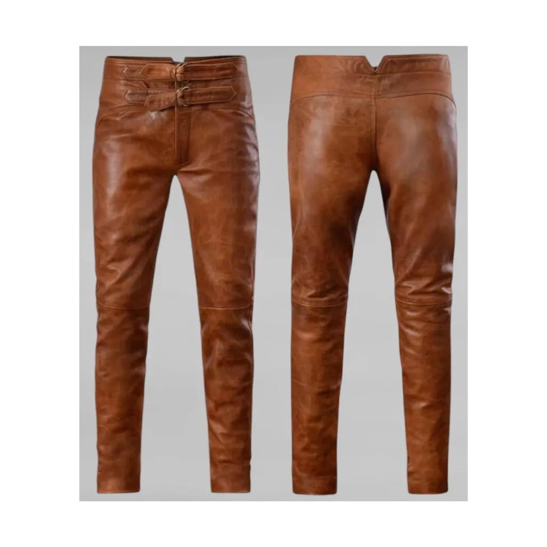 Men Brown Leather Pant With Buckle Belts | Premium Quality