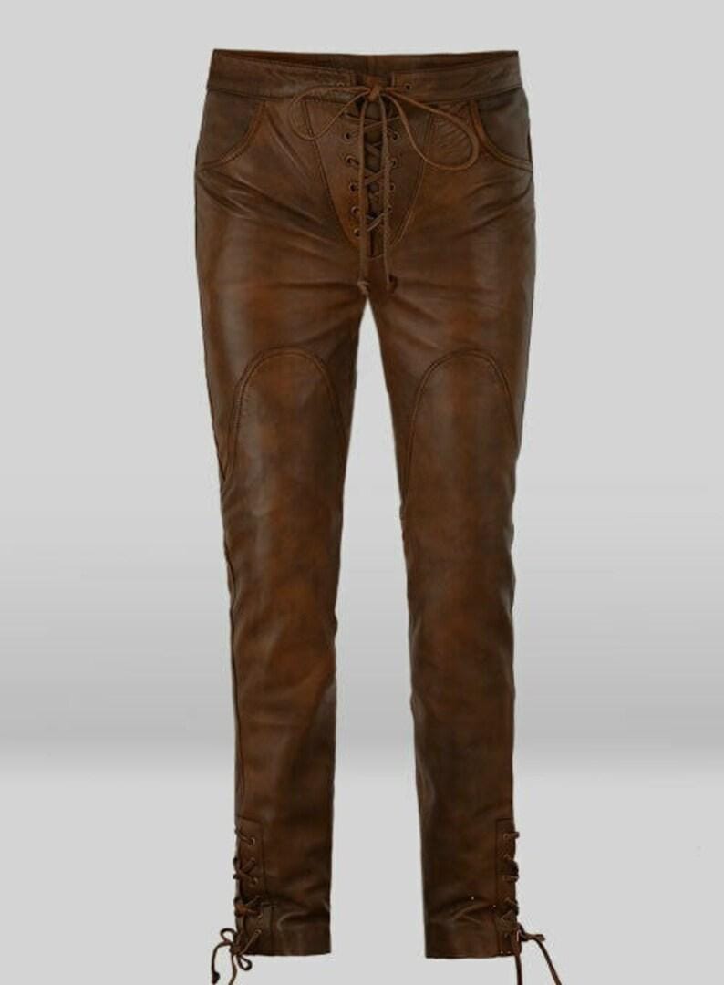 The Men Brown Leather Pant with Laces are both stylish and functional, making them a must-have for any fashion-forward wardrobe. These pants are made from high-quality brown leather, which gives them a rich, earthy tone that goes well with many outfits. The lace-up detail adds a unique, edgy flair and allows for an adjustable fit, ensuring maximum comfort. These pants have a soft texture and flexible design, providing ease of movement and making them perfect for casual outings and more dressed-up occasions. Whether you’re going out for a night on the town or looking to elevate your everyday style, these brown leather pants are the ideal choice.