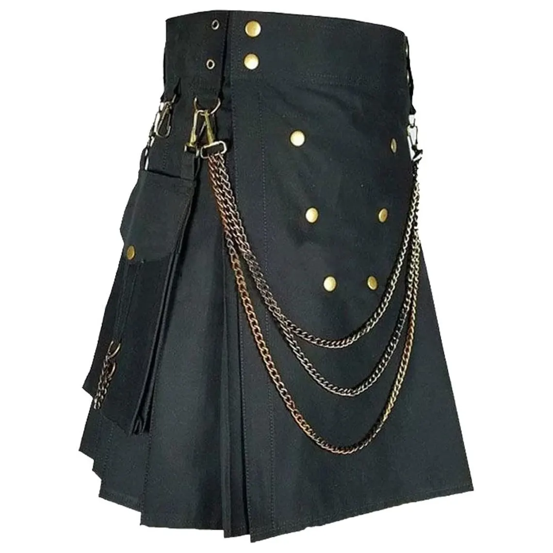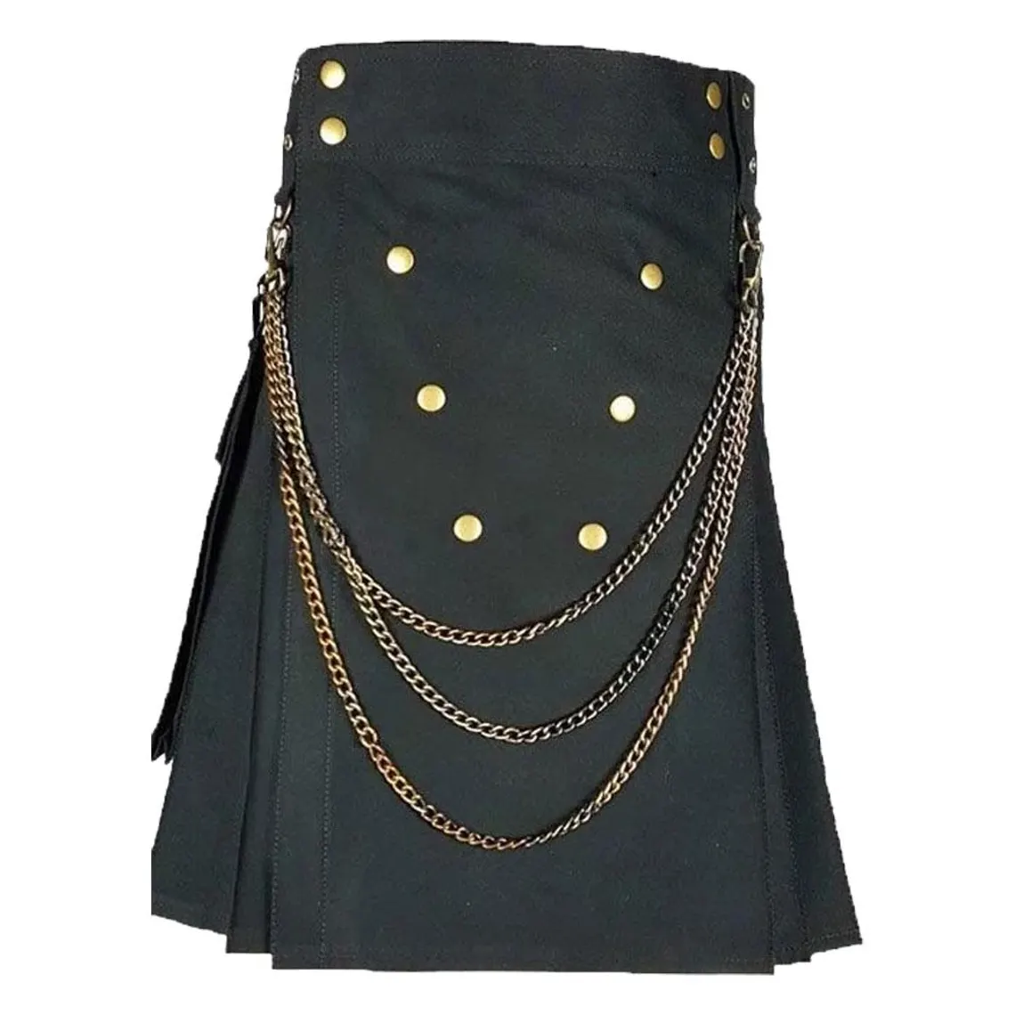Men’s Black Scottish Utility Cotton Kilt – Deluxe Chained with Cargo Pockets