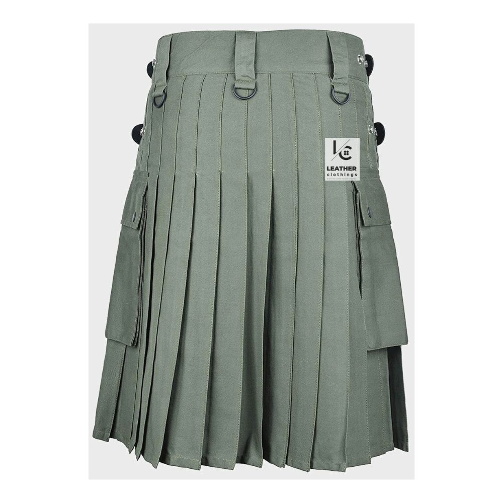 Men’s Green Scottish Utility Cotton Kilt – Tactical Duty with Cargo Pockets