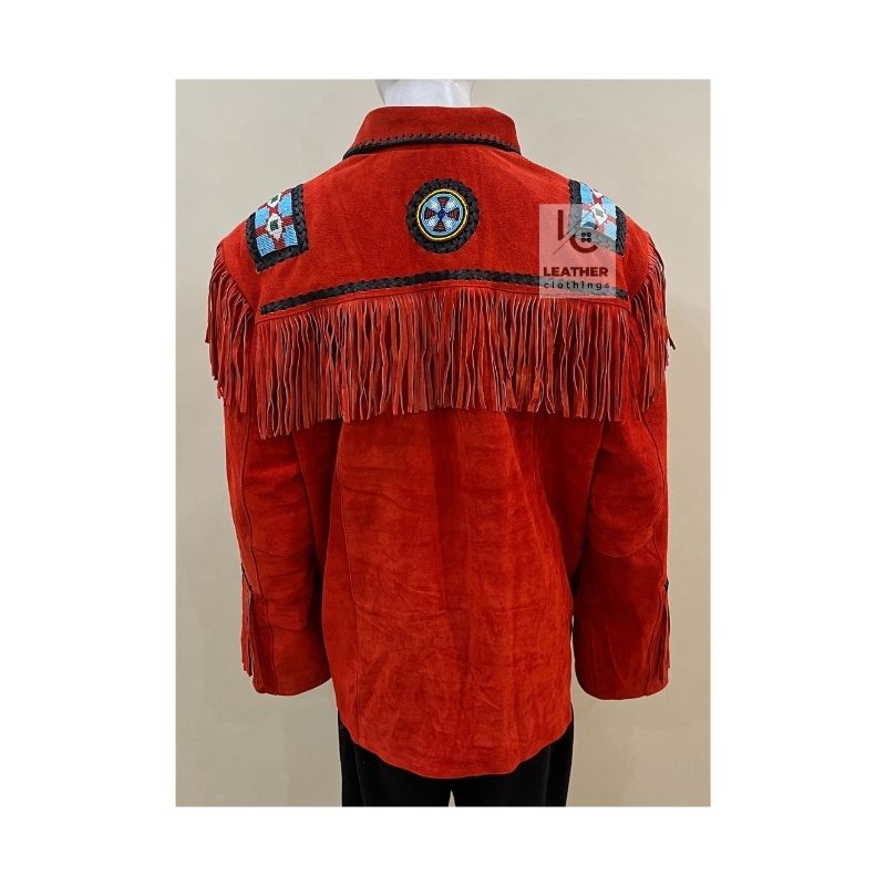 The Men’s Red Suede Jacket-Eagle Beaded Western Cowboy jacket is a high-quality, stylish, and rugged jacket made of red suede. It has intricate eagle-beaded details, adding a touch of Western flair. Whether you’re out on the town or at a casual gathering, this jacket will definitely make a statement. This classic piece combines timeless style with modern sensibilities, bringing authenticity and individuality to your wardrobe.