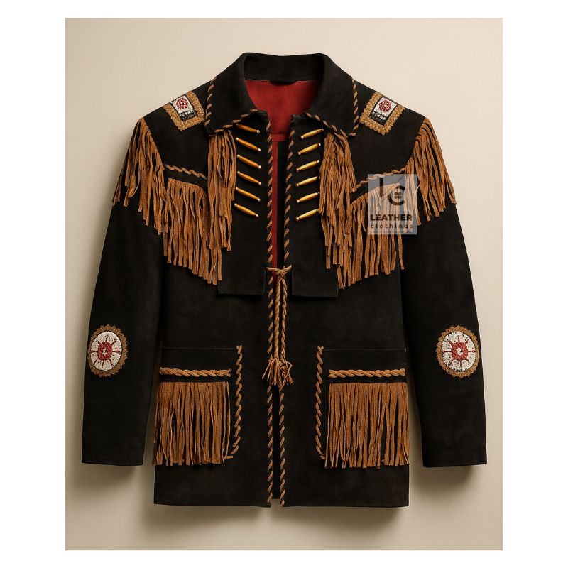 Mens Western Leather Jacket With Fringes, Bones & Beads