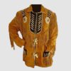 The Men’s Cowboy Eagle Beaded White Leather Jacket is a stunning piece that embodies rugged style and Western charm. Crafted from high-quality brown suede, this jacket features intricate beadwork and a bold eagle design on the back, creating a striking and unique look. The addition of fringe detailing along the sleeves and back adds a touch of movement and flair to the jacket. Perfect for adding a statement piece to any outfit, this jacket exudes a mix of vintage and modern appeal, making it a standout addition to any wardrobe: