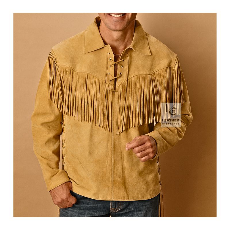 The Native American Buckskin Shirt showcases traditional style with a strong, classic look. Made from genuine leather, this shirt has a soft buckskin texture and flowing fringes for natural movement and a nod to tradition. It is lightweight, durable, and breathable, making it comfortable for all-day wear. Designed to fit true to size, this fringe shirt offers a confident fit while adding a handcrafted touch, cultural inspiration, and rugged elegance to your outfit.