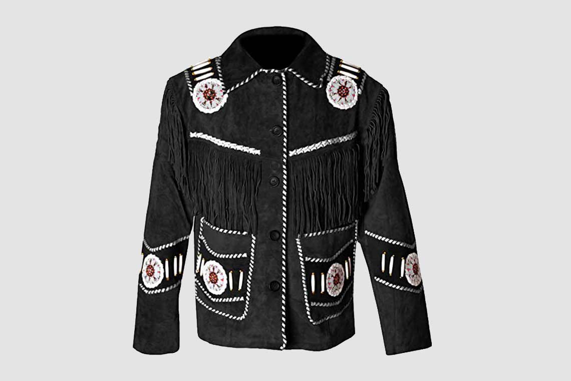 Traditional Western Leather Jacket For Sale, This Jacket is made of genuine high-quality leather which is soft, thin and comfortable.This western style Jacket can be made in any color. This jacket is made of real suede leather with bead work on sleeves, front and back Fringes and bones for western style .100% cotton inner lining. We Guarantee the Highest Quality at the Best Price.
