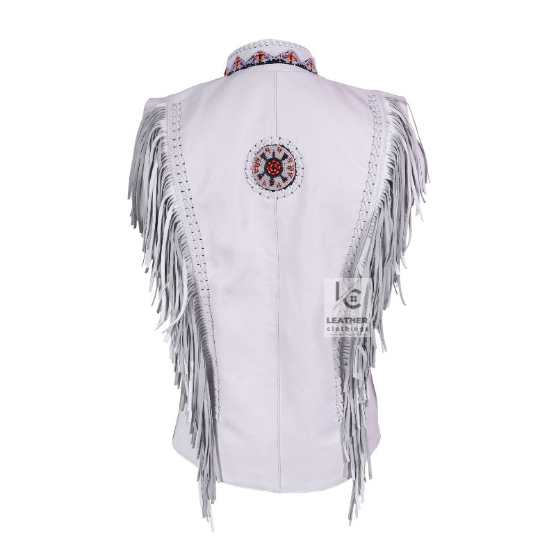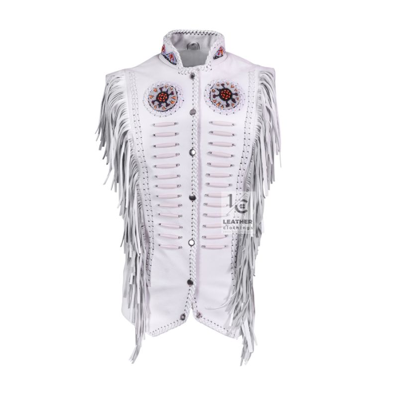 Get ready to embrace classic Western style with our Vibrant Western Cowboy White Leather Fringes Vest. This vest is made with great attention to detail, combining the timeless cowboy look with a modern twist. The pure white leather and beautiful fringes give it an undeniable charm and sophistication. Whether you want to make a bold statement or complete a variety of looks, this versatile vest is an essential addition to your wardrobe. Channel the spirit of the Wild West and stand out with our Cowboy White Leather Fringes Vest.