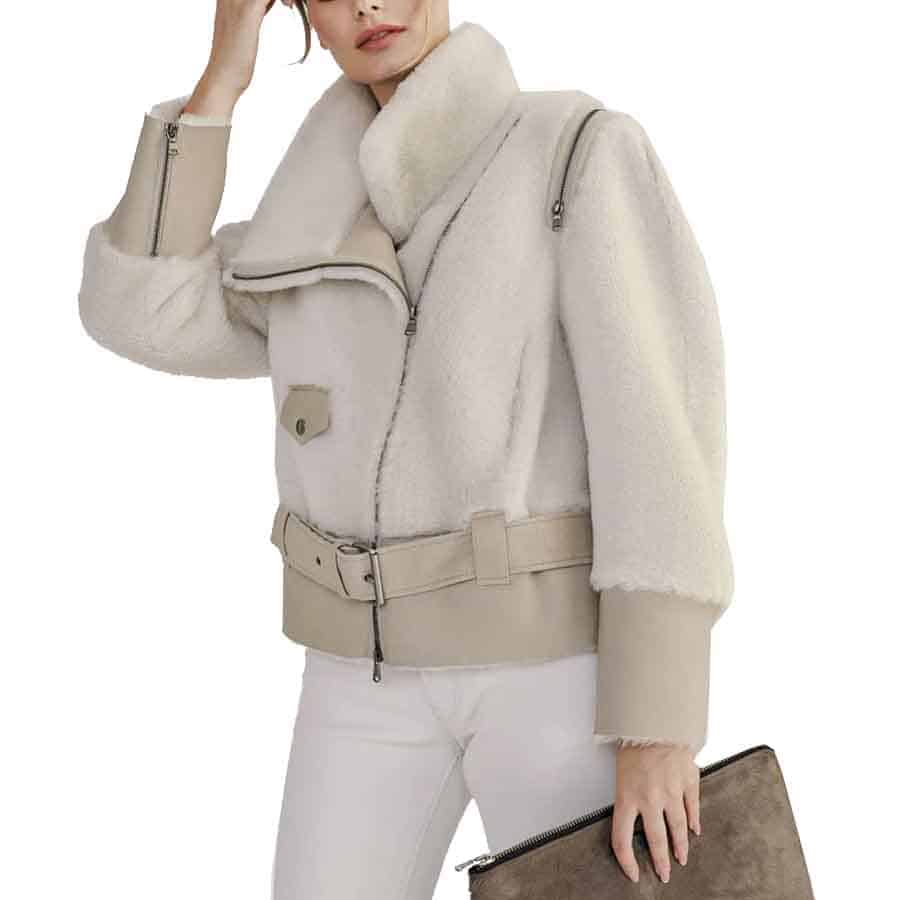 Design: Elegant ivory-white exterior with beige leather trim on cuffs, hem, and belt for a refined contrast.
